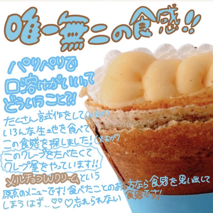地元産の旬のフルーツや野菜を取り入れたメニューもあり、甘いデザート系からお食事系まで幅広く楽しめます。生地は、「もちもちタイプ」と「パリパリタイプ」の2種類から選べるのも人気の理由です。