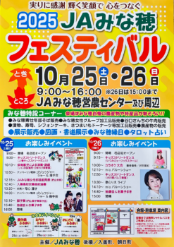 2025 JAみな穂フェスティバル開催のお知らせ 2025/09/29 イベントお知らせ \秋の入善を彩るにぎやかなイベント!/ JAみな穂が主催の恒例イベント「 JAみな穂フェスティバル」が開催されます✨ 農産物が大集合!振るまいやステージイベント、抽選会など、楽しい催しをご家族・ご友人そろってぜひお出かけください(*^^*) <2025 JAみな穂フェスティバル> 📅開催日 令和7年10月25日(土)・26日(日)9:00~16:00 ※26日は15:00まで 📍会場:JAみな穂営農センター周辺